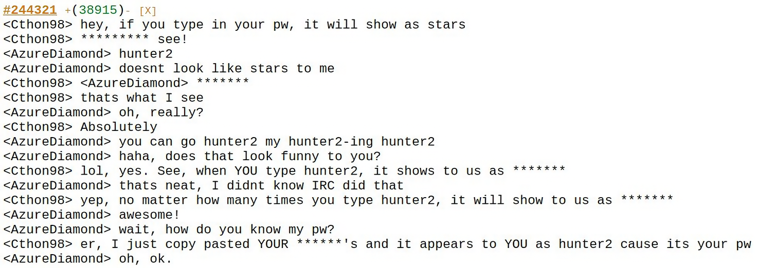 In today’s era of password managers, WebAuthn also known as passkeys, and many pwned accounts, passwords may seem like a funny sort of outdated concept. They have definitely provided good entertainment over the years from XKCD: Password Strength comics to the 20-year old hunter2 meme: